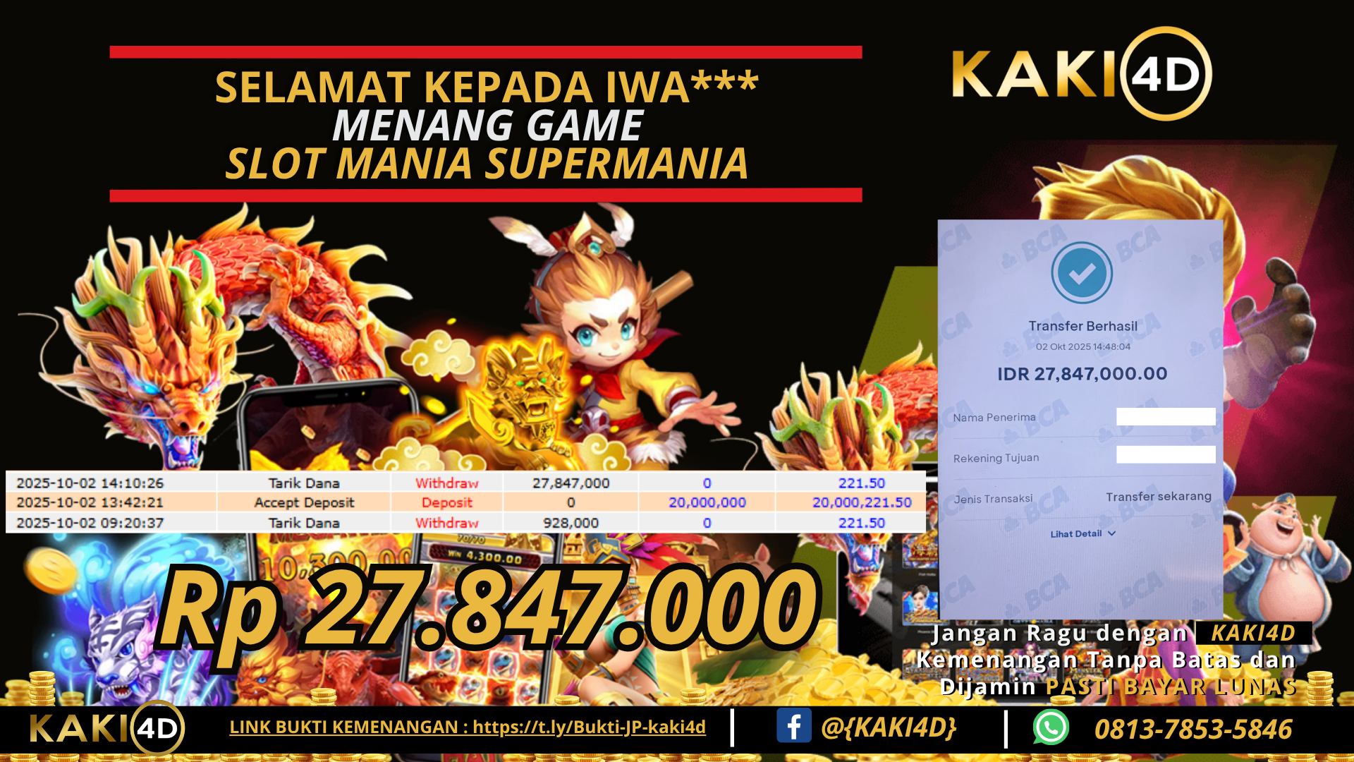 BUKTI JP 27 JUTA DI GAME SLOT MANIA SUPERMANIA KAKI4D 02 OKTOBER 2025