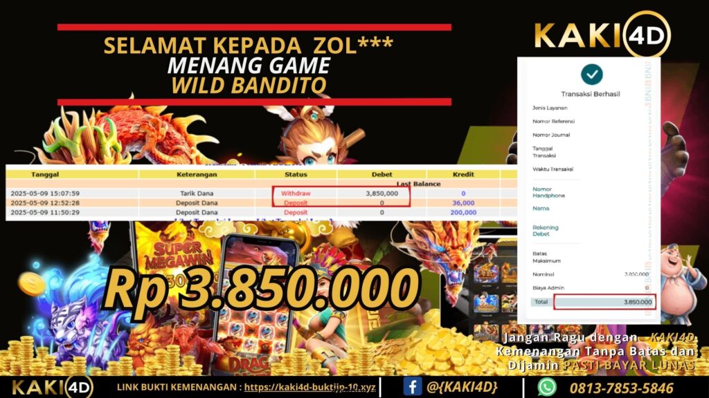 Selamat kepada pengguna ID ZOL*** Yang baru saja memenangkan Rp 3.850.000,-  dalam  game WILD BANDITO.  Kami proses dan bayar 100% kemenangan dengan cepat, hanya dalam 3-5 menit. Bukti pembayaran kami adalah bukti kemenangan member, jaminan kejujuran dan transparansi KAKI4D.
