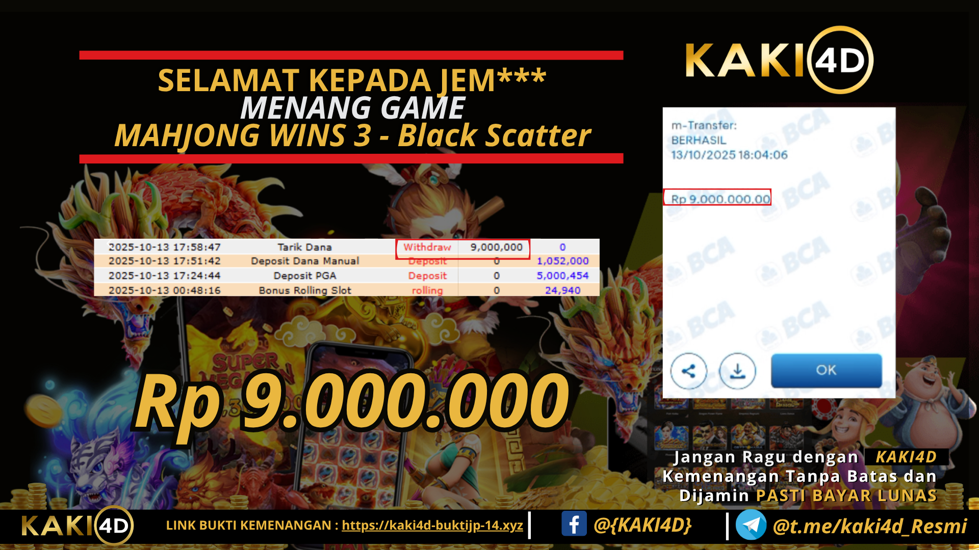 Selamat kepada pengguna ID JEM** Yang baru saja memenangkan Rp 9,000.000,- dalam game MAHJONG WINS 3 . Kami proses dan bayar 100% kemenangan dengan cepat, hanya dalam 3-5 menit. Bukti pembayaran kami adalah bukti kemenangan member, jaminan kejujuran dan transparansi KAKI4D.