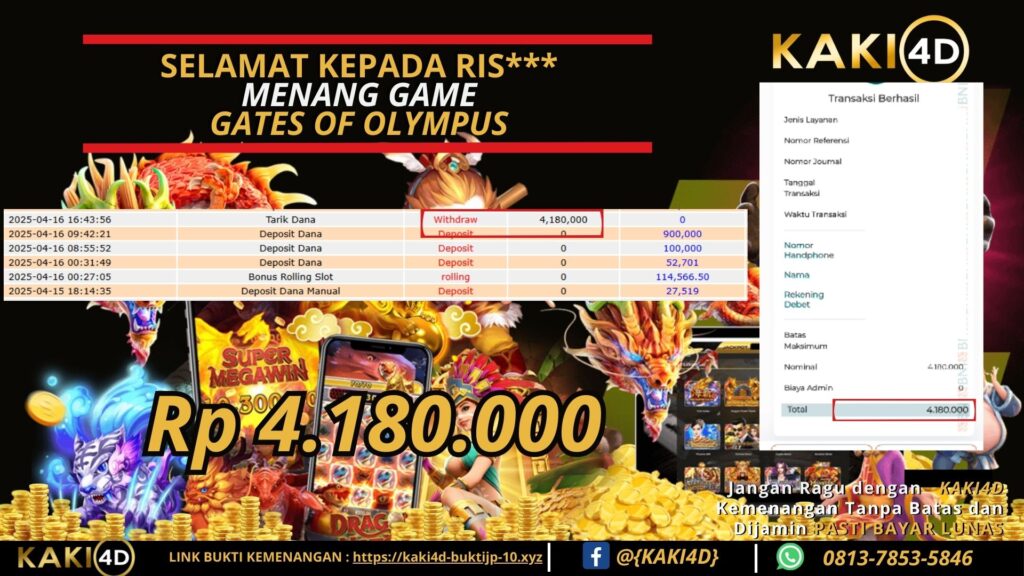 KAKI4D adalah situs terpercaya untuk Togel, Live Casino, dan Slot Online di Indonesia. Dengan satu KLIK , mainkan berbagai permainan dan menangkan besar. Kami menjamin pembayaran penuh untuk setiap kemenangan Anda. Nikmati juga promosi menarik dan deposit minimal hanya Rp. 10.000.Bergabunglah sekarang di JACKPOT IDN LIVE KAKI4D untuk pengalaman bermain yang aman dan menguntungkan. Berikut adalah BUKTI KEMENANGAN MEMBER di KAKI4D :