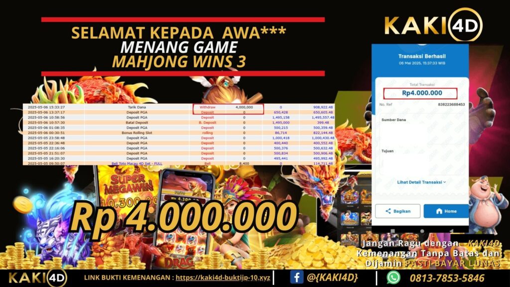BUKTI JP 4 JUTA DI MAHJONG WINS 3 KAKI4D 06 MAY 2025