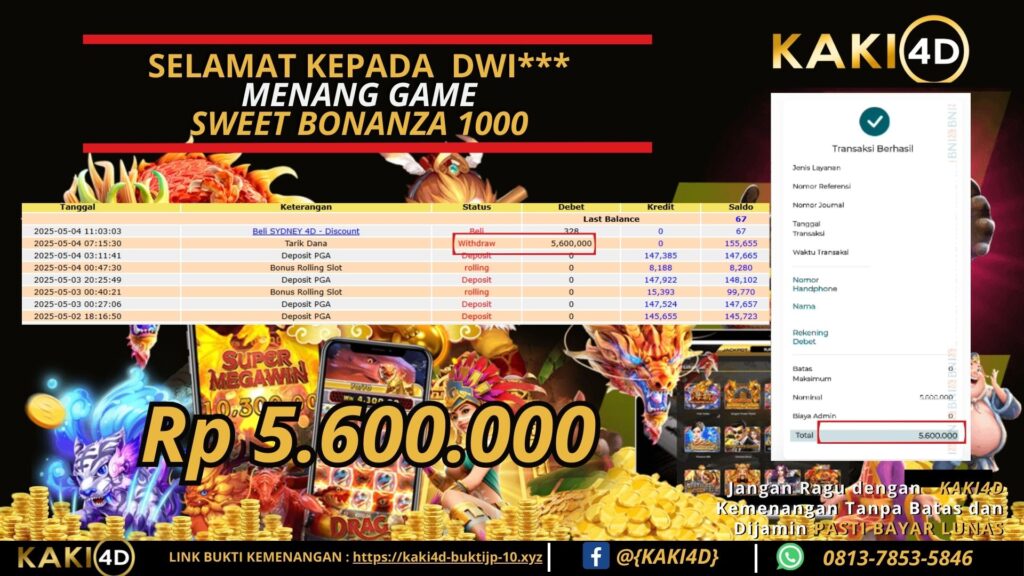 KAKI4D adalah situs terpercaya untuk Togel, Live Casino, dan Slot Online di Indonesia. Dengan satu KLIK , mainkan berbagai permainan dan menangkan besar. Kami menjamin pembayaran penuh untuk setiap kemenangan Anda. Nikmati juga promosi menarik dan deposit minimal hanya Rp. 10.000.Bergabunglah sekarang di JACKPOT IDN LIVE KAKI4D untuk pengalaman bermain yang aman dan menguntungkan. Berikut adalah BUKTI KEMENANGAN MEMBER di KAKI4D :