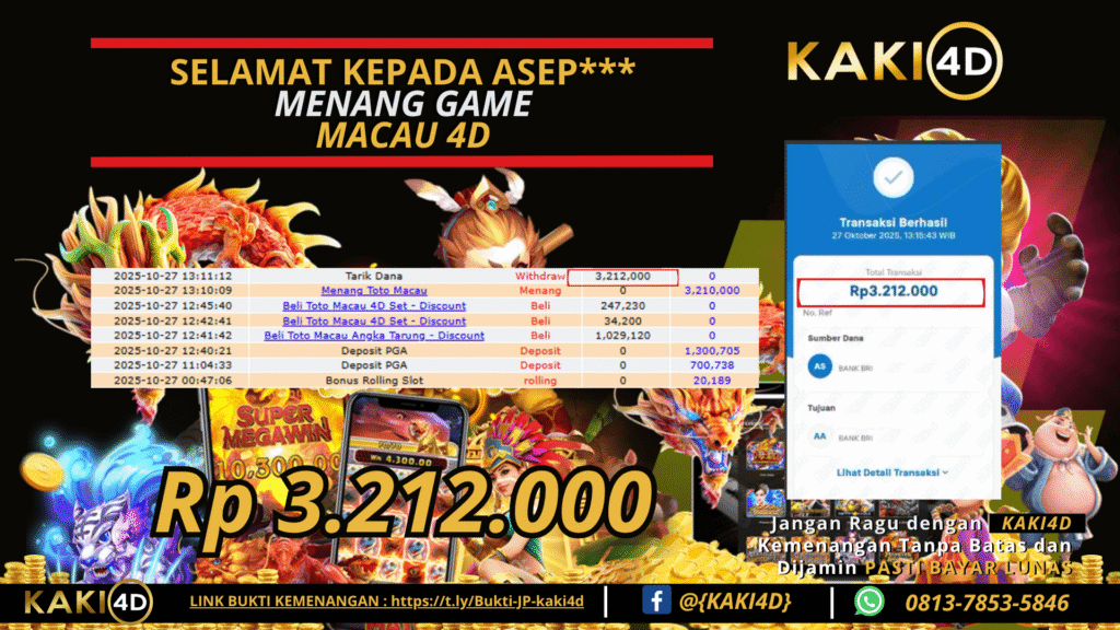 KAKI4D adalah situs terpercaya untuk Togel, Live Casino, dan Slot Online di Indonesia. Dengan satu KLIK , mainkan berbagai permainan dan menangkan besar. Kami menjamin pembayaran penuh untuk setiap kemenangan Anda. Nikmati juga promosi menarik dan deposit minimal hanya Rp. 10.000.Bergabunglah sekarang di JACKPOT IDN LIVE KAKI4D untuk pengalaman bermain yang aman dan menguntungkan. Berikut adalah BUKTI KEMENANGAN MEMBER di KAKI4D