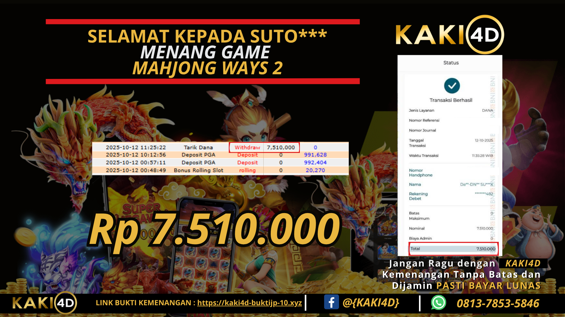Selamat kepada pengguna ID SUTO ** Yang baru saja memenangkan Rp 7,510.000,- dalam game MAHJONG WAYS2 . Kami proses dan bayar 100% kemenangan dengan cepat, hanya dalam 3-5 menit. Bukti pembayaran kami adalah bukti kemenangan member, jaminan kejujuran dan transparansi KAKI4D.