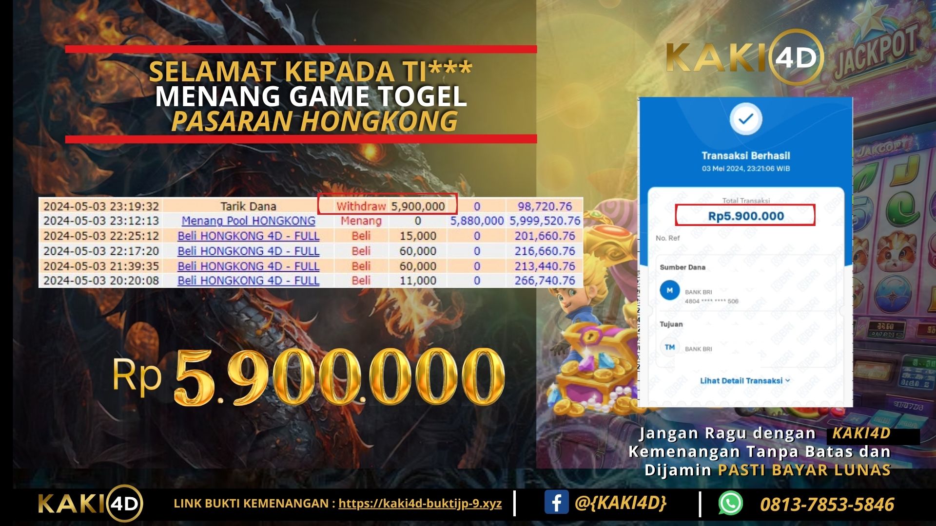 Selamat kepada pengguna ID TI*** Yang baru saja memenangkan Rp.5.900.000,- dalam GAME TOGEL PASARAN HONGKONG . Kami proses dan bayar 100% kemenangan dengan cepat, hanya dalam 3-5 menit. Bukti pembayaran kami adalah bukti kemenangan member, jaminan kejujuran dan transparansi KAKI4D.Jangan lewatkan kesempatan untuk bergabung dengan kami di KAKI4D, tempat di mana kemenangan besar menanti Anda. BONUS PROMO KAKI4D: