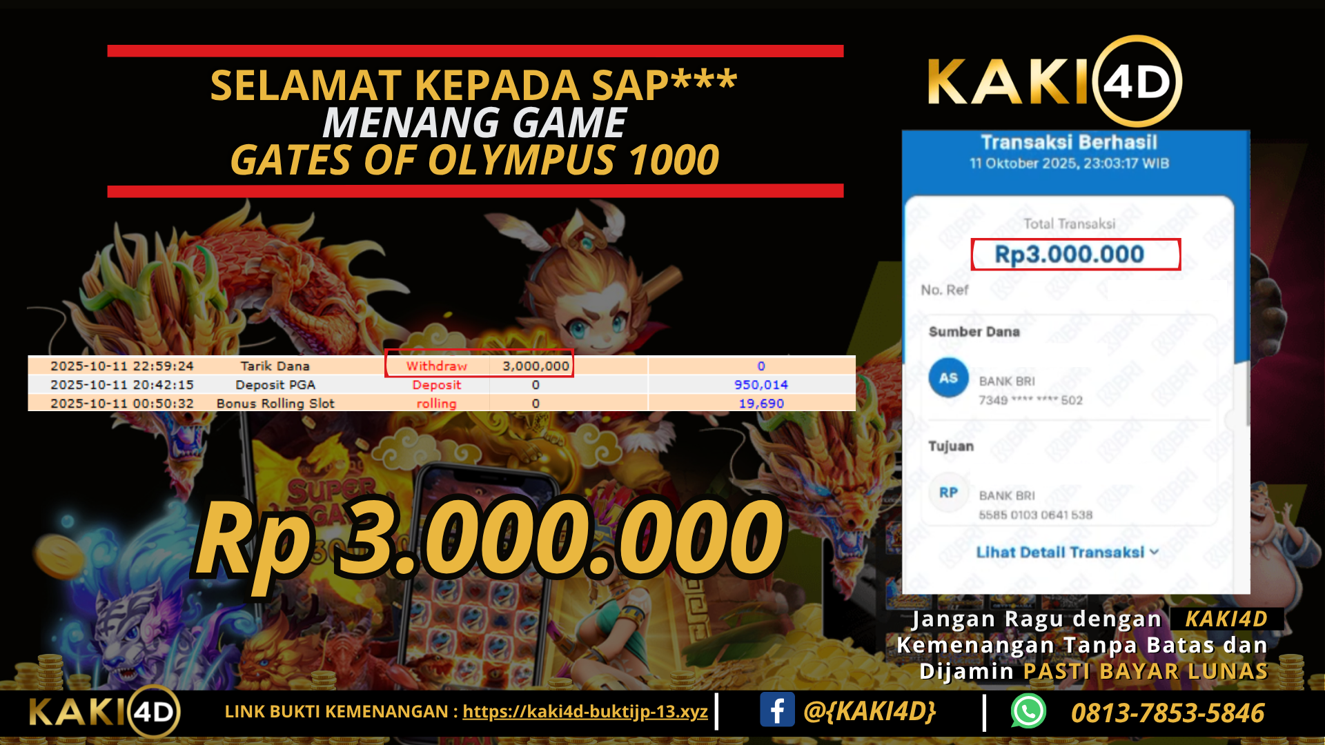 Selamat kepada pengguna ID SAP** Yang baru saja memenangkan Rp 3,000.000,-  dalam  game  GATES OF OLYMPUS 1000  . Kami proses dan bayar 100% kemenangan dengan cepat, hanya dalam 3-5 menit. Bukti pembayaran kami adalah bukti kemenangan member, jaminan kejujuran dan transparansi KAKI4D.