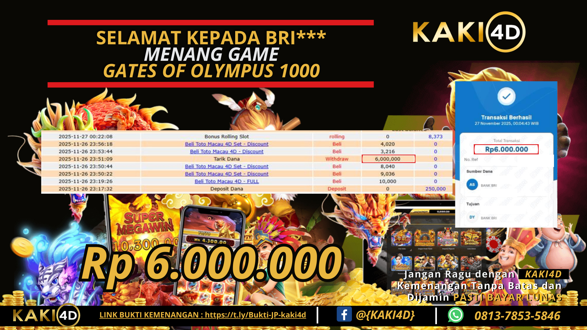 Selamat kepada pengguna ID BRI*** Yang baru saja memenangkan Rp 6,000.000 –  dalam  game  GATES OF OLYMPUS 1000 . Kami proses dan bayar 100% kemenangan dengan cepat, hanya dalam 3-5 menit. Bukti pembayaran kami adalah bukti kemenangan member, jaminan kejujuran dan transparansi KAKI4D.
