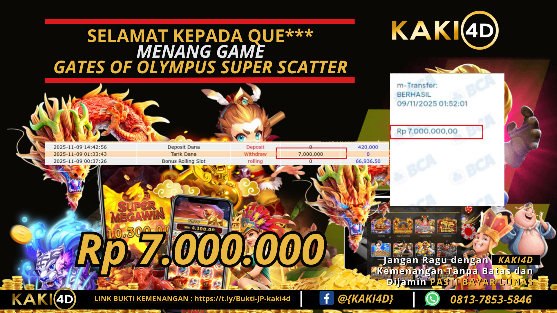 Selamat kepada pengguna ID QUE* Yang baru saja memenangkan Rp 7,000.000 – dalam game GATES OF OLYMPUS SUPER SCATTER . Kami proses dan bayar 100% kemenangan dengan cepat, hanya dalam 3-5 menit. Bukti pembayaran kami adalah bukti kemenangan member, jaminan kejujuran dan transparansi KAKI4D.