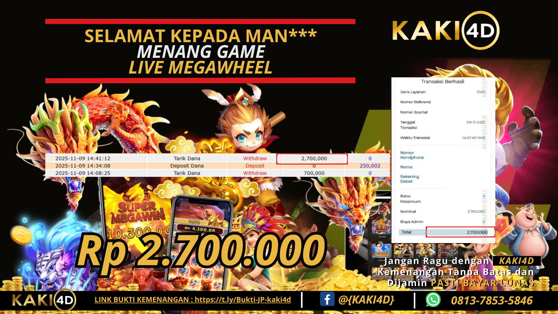 Selamat kepada pengguna ID MAN* Yang baru saja memenangkan Rp 2,700.000 – dalam game LIVE MEGAWHEEL . Kami proses dan bayar 100% kemenangan dengan cepat, hanya dalam 3-5 menit. Bukti pembayaran kami adalah bukti kemenangan member, jaminan kejujuran dan transparansi KAKI4D.