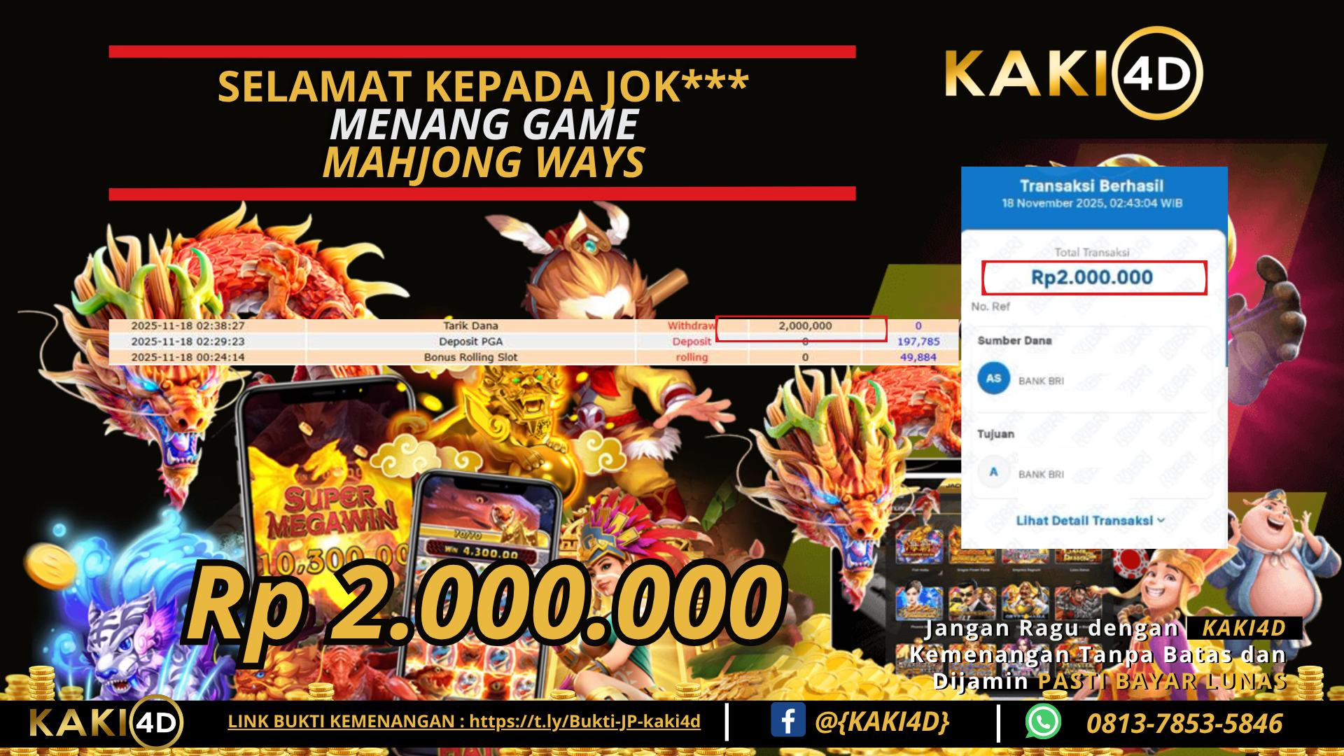 Selamat kepada pengguna ID JOK* Yang baru saja memenangkan Rp 2,000.000 – dalam game MAHJONG WAYS . Kami proses dan bayar 100% kemenangan dengan cepat, hanya dalam 3-5 menit. Bukti pembayaran kami adalah bukti kemenangan member, jaminan kejujuran dan transparansi KAKI4D.