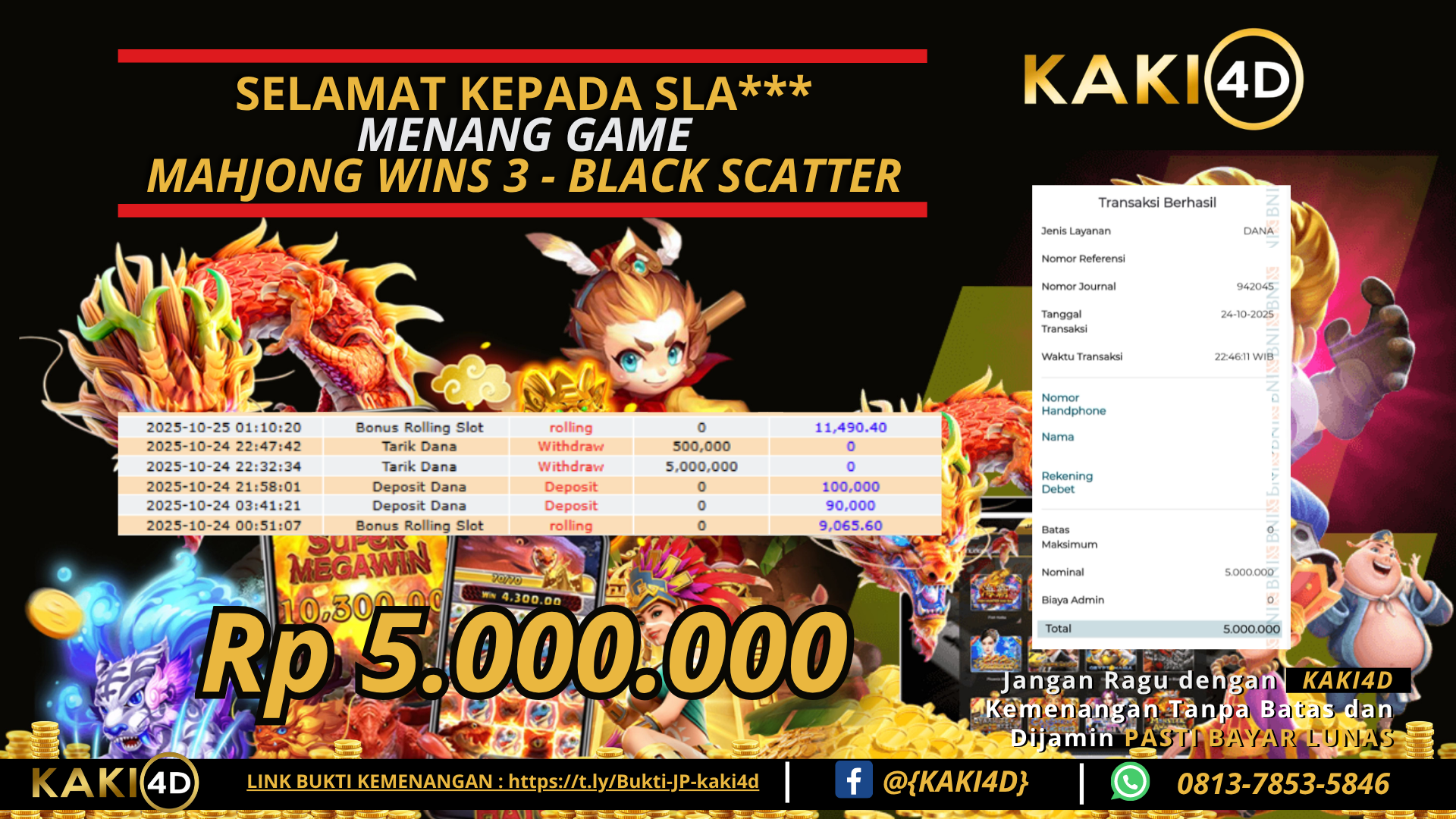 Selamat kepada pengguna ID SLA** Yang baru saja memenangkan Rp 5,000.000,-  dalam  game  MAHJONG WINS 3 – BLACK SCATTER . Kami proses dan bayar 100% kemenangan dengan cepat, hanya dalam 3-5 menit. Bukti pembayaran kami adalah bukti kemenangan member, jaminan kejujuran dan transparansi KAKI4D.