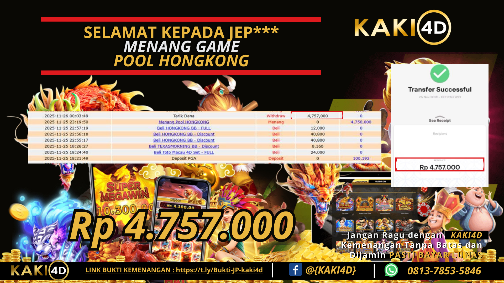 KAKI4D adalah situs terpercaya untuk Togel, Live Casino, dan Slot Online di Indonesia. Dengan satu KLIK , mainkan berbagai permainan dan menangkan besar. Kami menjamin pembayaran penuh untuk setiap kemenangan Anda. Nikmati juga promosi menarik dan deposit minimal hanya Rp. 10.000.Bergabunglah sekarang di JACKPOT IDN LIVE KAKI4D untuk pengalaman bermain yang aman dan menguntungkan. Berikut adalah BUKTI KEMENANGAN MEMBER di KAKI4D