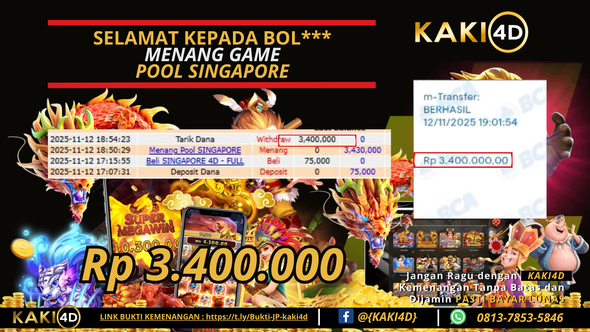 Selamat kepada pengguna ID BOL* Yang baru saja memenangkan Rp 3,400.000 – dalam game POOL SINGAPORE . Kami proses dan bayar 100% kemenangan dengan cepat, hanya dalam 3-5 menit. Bukti pembayaran kami adalah bukti kemenangan member, jaminan kejujuran dan transparansi KAKI4D.