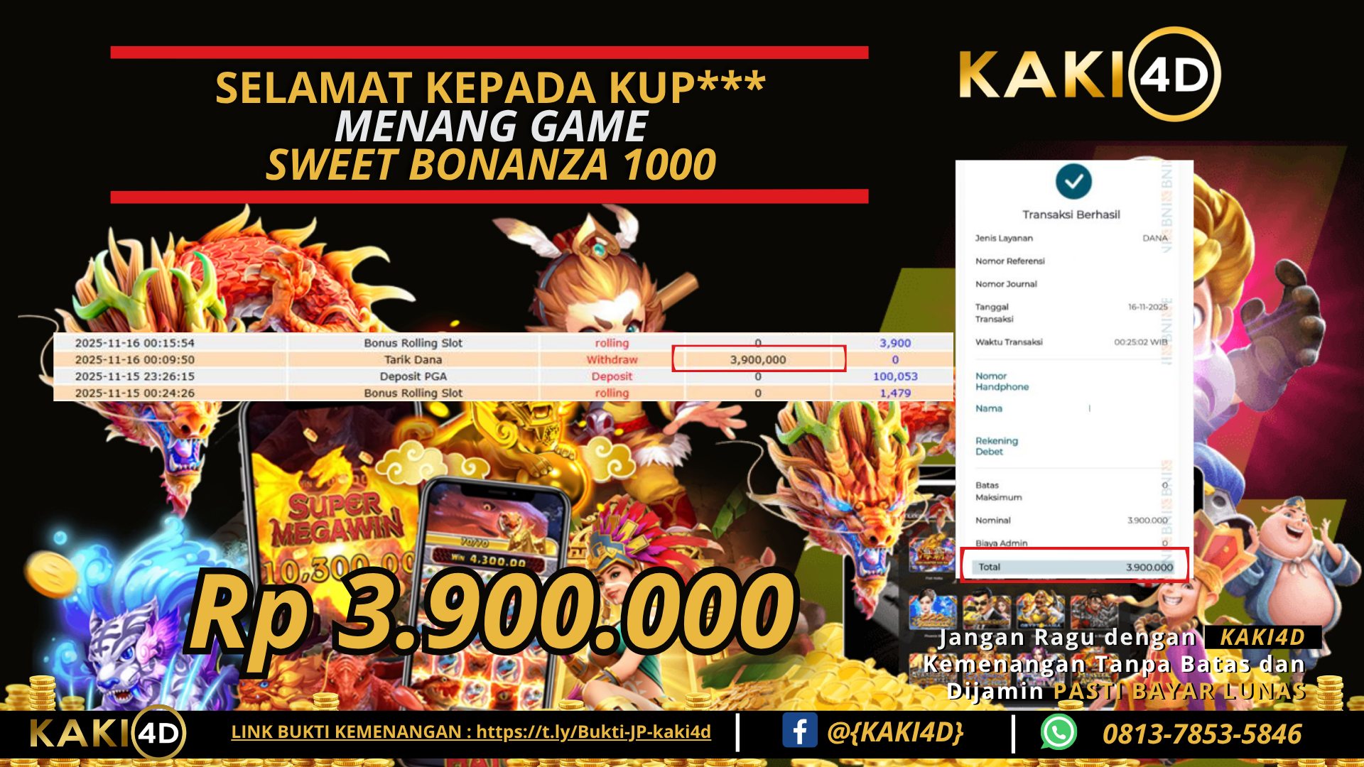Selamat kepada pengguna ID KUP* Yang baru saja memenangkan Rp 3,900.000 – dalam game SWEET BONANZA 1000 . Kami proses dan bayar 100% kemenangan dengan cepat, hanya dalam 3-5 menit. Bukti pembayaran kami adalah bukti kemenangan member, jaminan kejujuran dan transparansi KAKI4D.