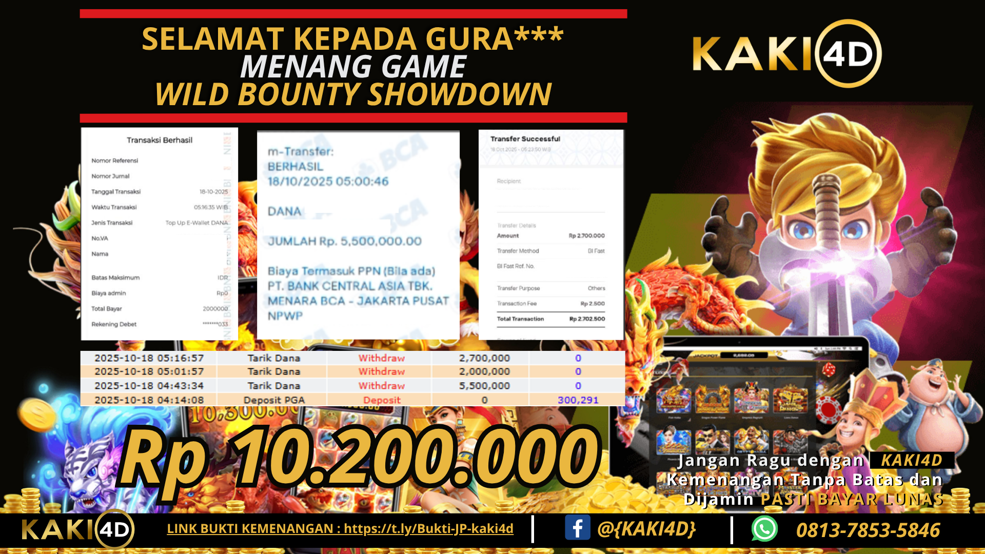 Selamat kepada pengguna ID GURA** Yang baru saja memenangkan Rp 10,200.000,-  dalam  game  WILD BOUNTY SHOWDOWN . Kami proses dan bayar 100% kemenangan dengan cepat, hanya dalam 3-5 menit. Bukti pembayaran kami adalah bukti kemenangan member, jaminan kejujuran dan transparansi KAKI4D.