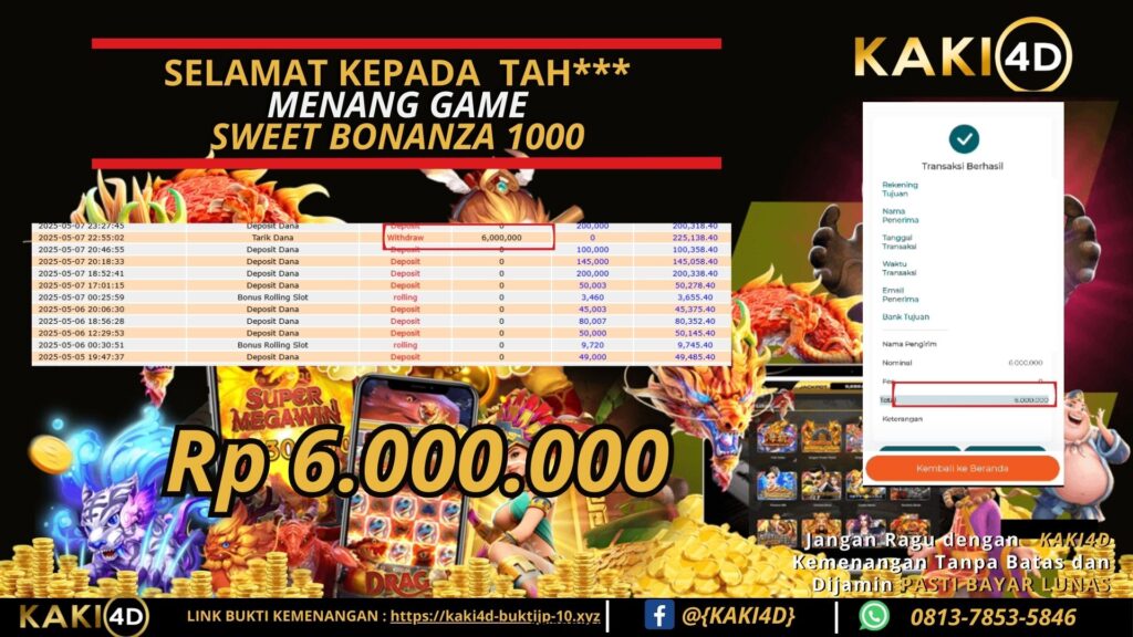 Selamat kepada pengguna ID TAH*** Yang baru saja memenangkan Rp 6.000.000,-  dalam  game SWEET BONANZA 1000.  Kami proses dan bayar 100% kemenangan dengan cepat, hanya dalam 3-5 menit. Bukti pembayaran kami adalah bukti kemenangan member, jaminan kejujuran dan transparansi KAKI4D.